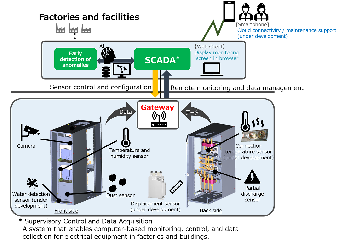 To address the shortage of electrical safety personnel, the growing number of renewable energy installations, and the risk of unexpected failures in aging equipment, Mitsubishi Electric installs sensors and cameras on power distribution panels to enable remote, continuous monitoring. This service enhances the efficiency of safety operations and supports stable facility management, thereby contributing to the resolution of pressing social issues.