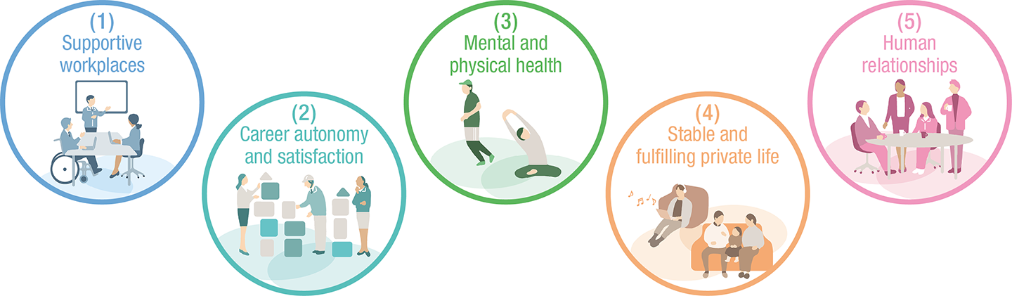 We will promote well-balanced measures in line with the five areas of focus below to increase the well-being of the varied and versatile human capital working at Mitsubishi Electric.