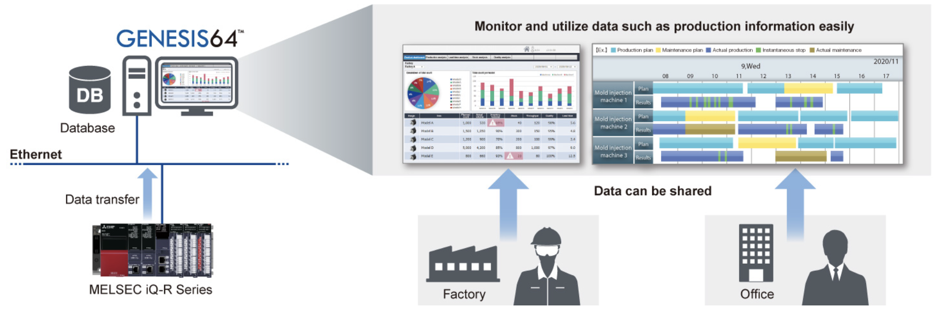 - Data in the database can be easily visualized by the extensive compatibility with SCADA software GENESIS64™ and such, data analysis can be utilized for quality control