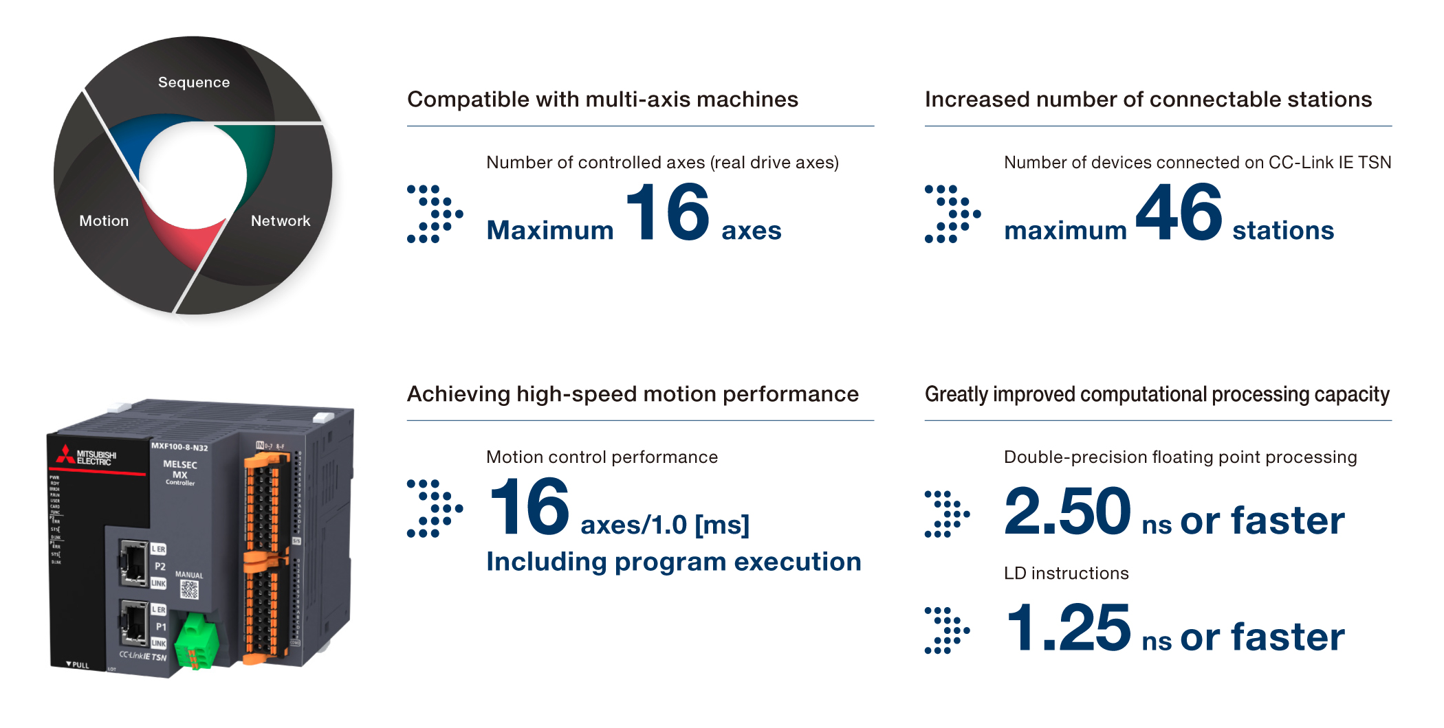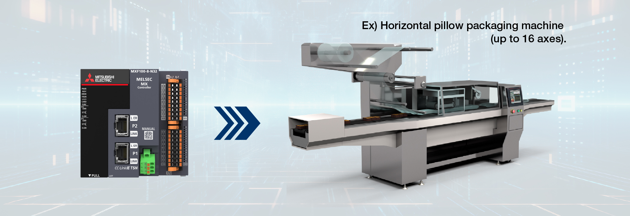 Dengan mengintegrasikan pengendalian urutan, pengendalian gerak, dan pengendalian jaringan pada platform MELSEC MX Controller, pengendalian yang lebih cepat dan akurat dapat dicapai.