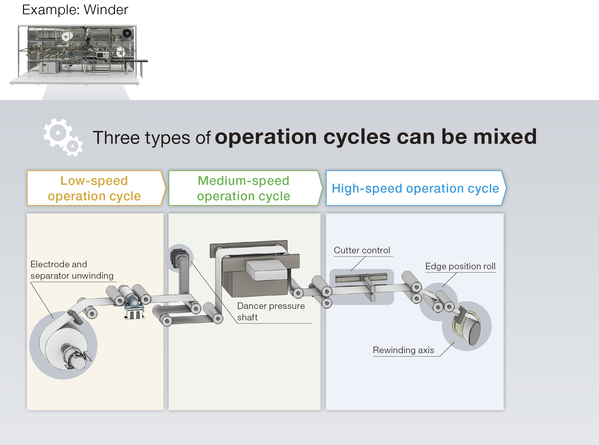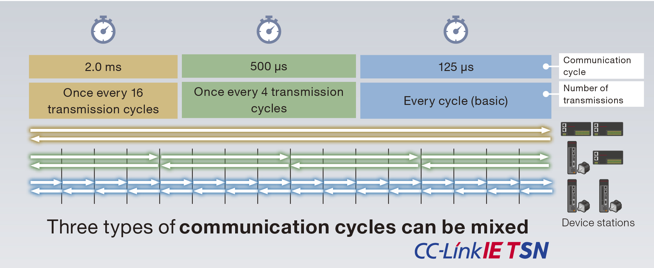 Dengan satu MELSEC MX Controller, hingga tiga siklus operasi dan komunikasi yang berbeda dapat diatur untuk setiap sumbu dan stasiun perangkat.