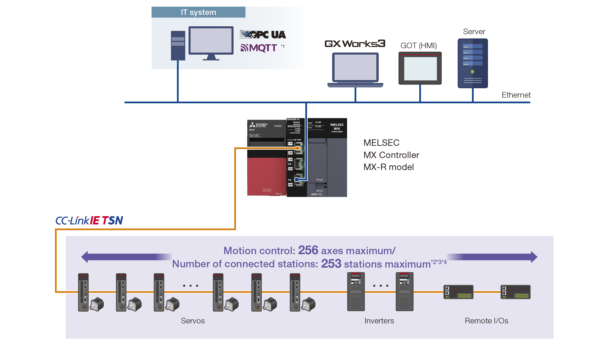 Sistem yang beragam dan canggih dapat dibangun dengan menggunakan model MX-R bersama modul seri MELSEC iQ-R.