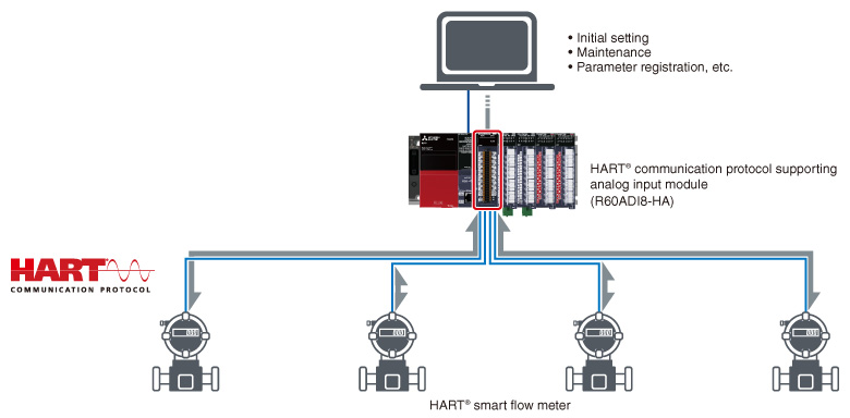 Komunikasi dengan perangkat lapangan yang mendukung komunikasi HART® dimungkinkan. Modul input analog yang mendukung protokol komunikasi HART® dapat membaca data yang dimiliki oleh setiap perangkat dan menulis parameter ke setiap perangkat. Pemeliharaan preventif perangkat lapangan dan pengurangan waktu pemeliharaan dapat direalisasikan.