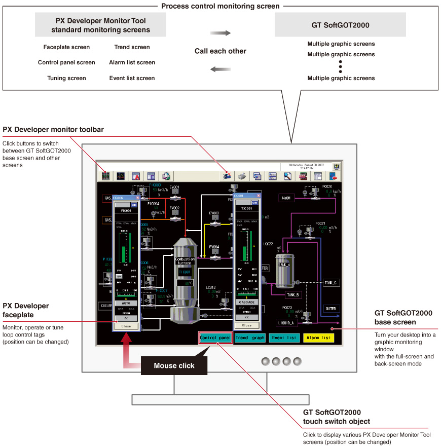 - PX Developer Monitor Tool and GT SoftGOT2000 can mutually call their screens*2, significantly reducing process control screen creation time