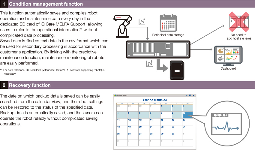 Bandingkan kondisi robot dengan dan tanpa kesalahan dengan mudah dengan menggabungkan informasi operasional harian robot secara otomatis dan mengelola data riwayat.
