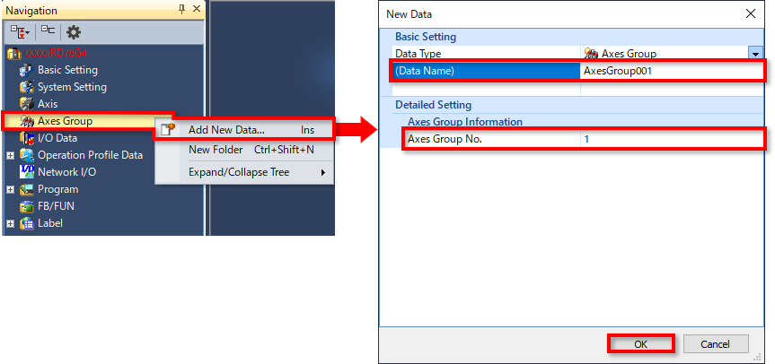 Chúng ta sử dụng cài đặt mặc định tại đây: tên dữ liệu "AxesGroup001" và số nhóm các trục "1".