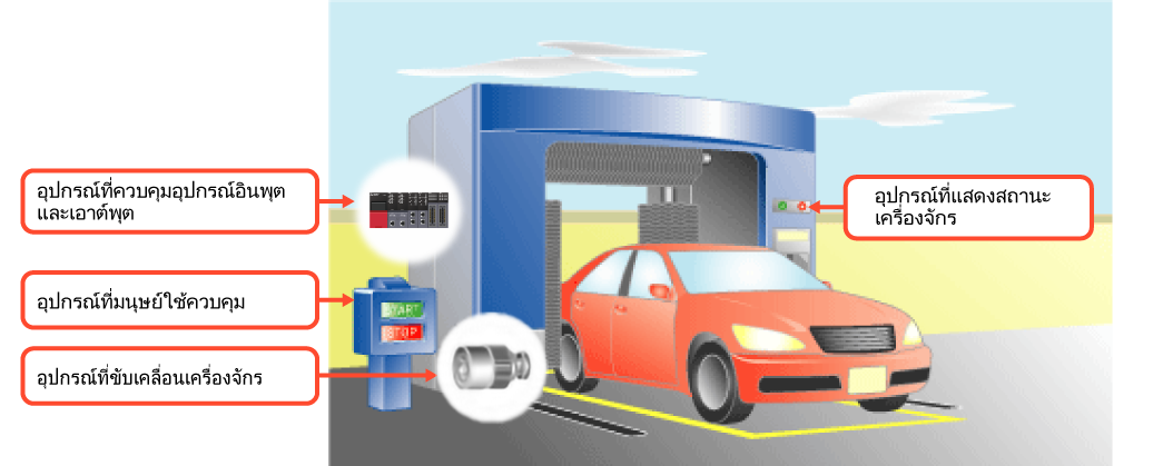 | อุปกรณ์อินพุต | อุปกรณ์ที่ตรวจจับสถานะของเครื่องจักร | ตัวรับรู้สิ่งใกล้เคียงที่ตรวจจับรถยนต์ซึ่งเข้าใกล้เครื่องจักร |