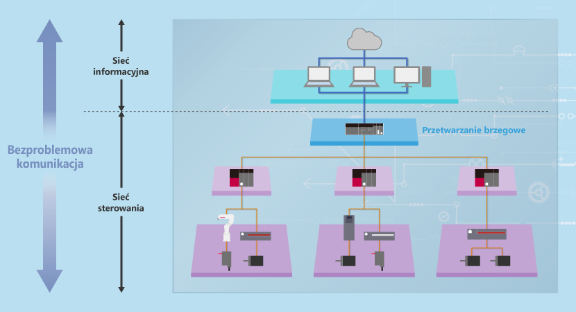 Obecnie możemy płynnie łączyć sieć informacyjną z siecią przemysłową*. Możliwe jest połączenie urządzeń od serwera hosta w sieci informacyjnej do urządzeń końcowych, takich jak czujnik w zakładzie produkcyjnym.