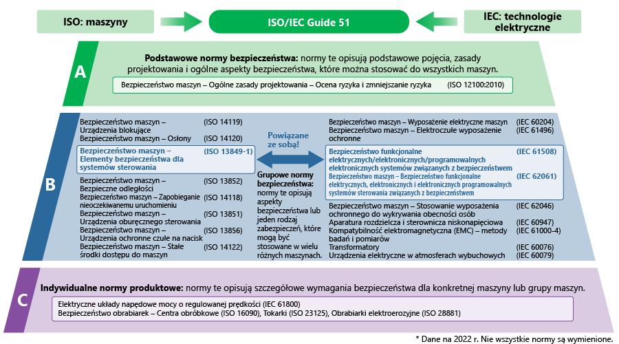 Międzynarodowe normy bezpieczeństwa maszyn są sklasyfikowane hierarchicznie w trzech grupach: podstawowe normy bezpieczeństwa (normy typu A), grupowe normy bezpieczeństwa (normy typu B) i indywidualne normy produktowe (normy typu C).