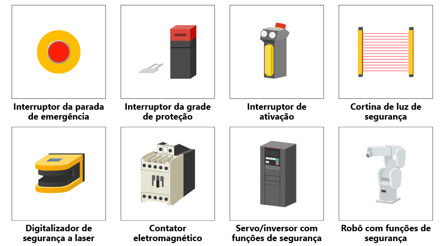 Os dispositivos de segurança típicos (componentes de segurança) para a proteção são mostrados a seguir.