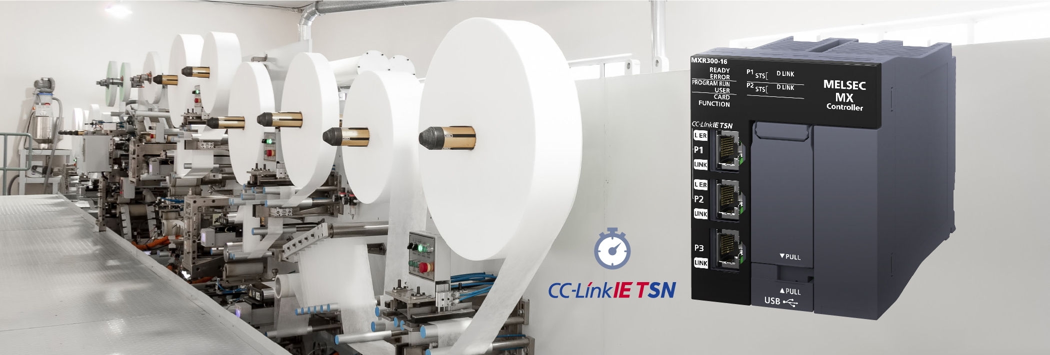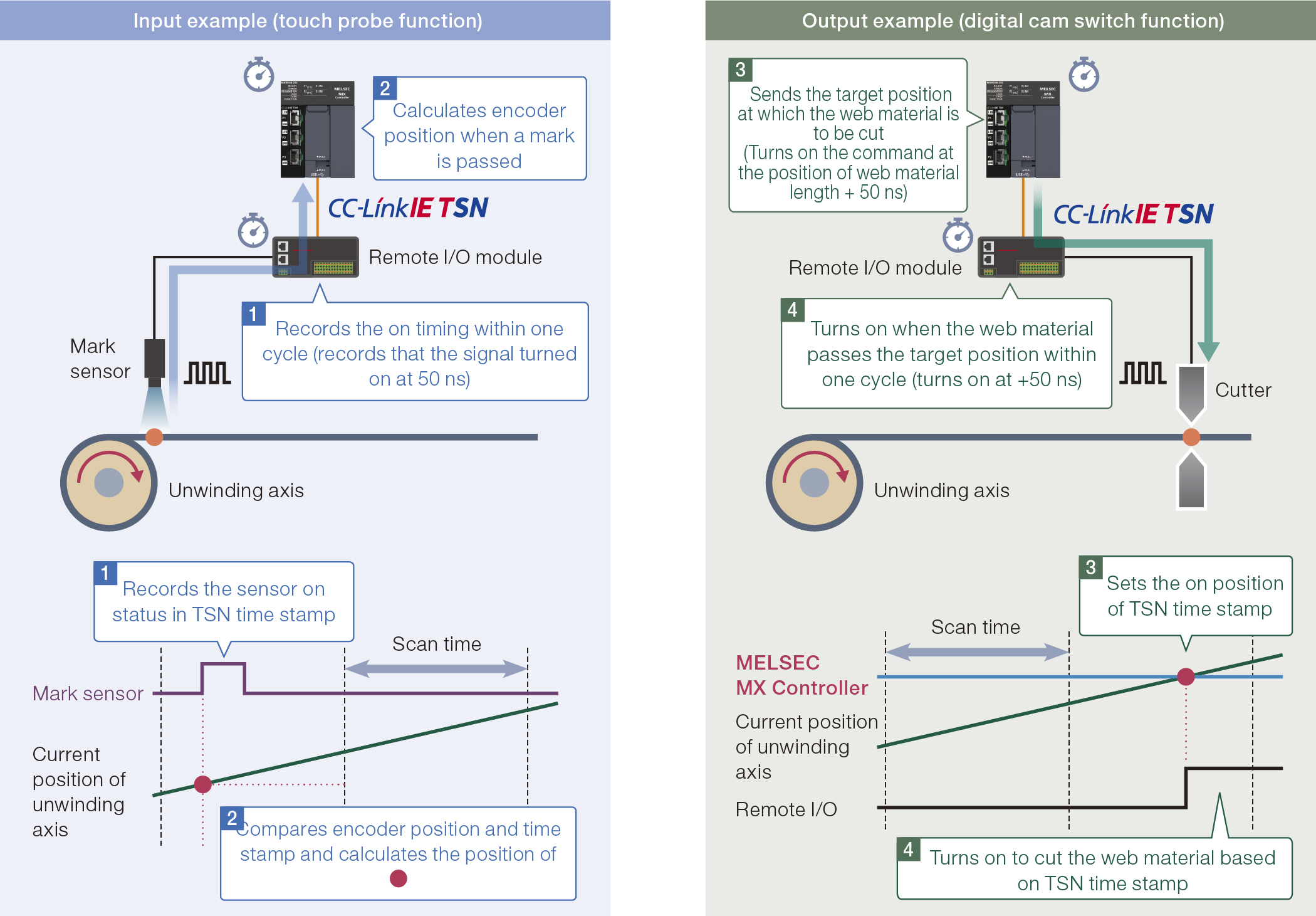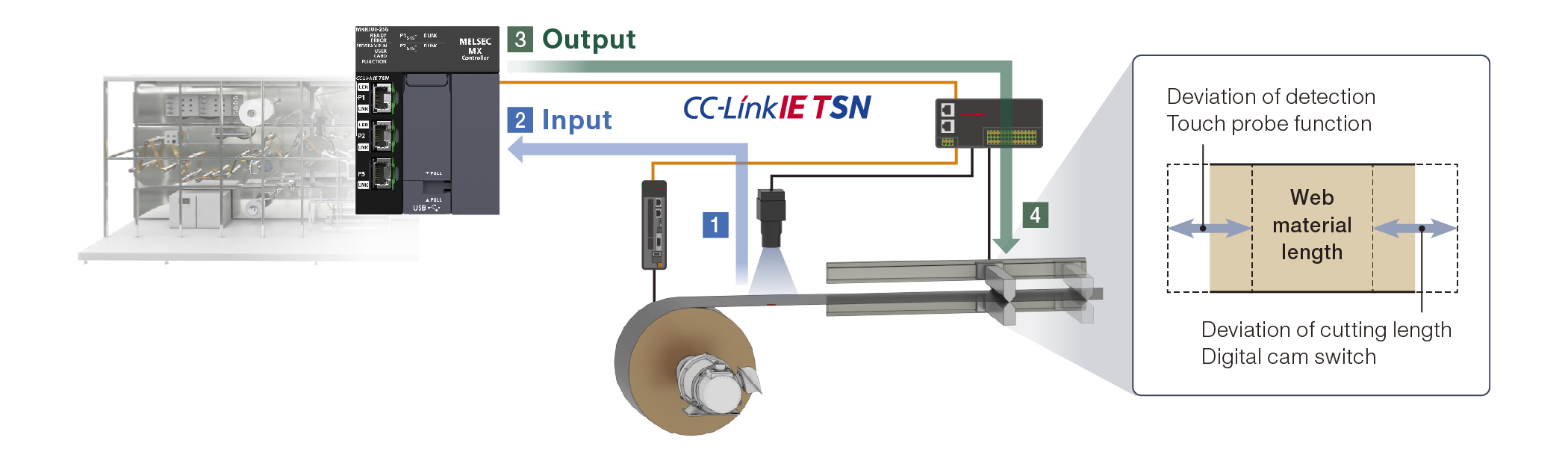 Even in applications that require high-speed I/O control without variability, such as roll-to-roll control, the MX Controller provides precise I/O over the network that is not dependent on the scan time. Minimized jitter in the I/O timing of mark detection and cutting reduces variations in web material detection and cut length. This improves yield in high-speed production lines.
