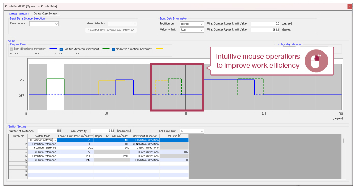 Setting values by adjusting the graph on the screen with mouse operations eliminates the need to convert time, significantly reducing working hours.