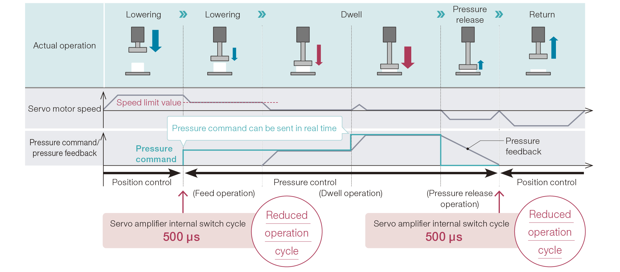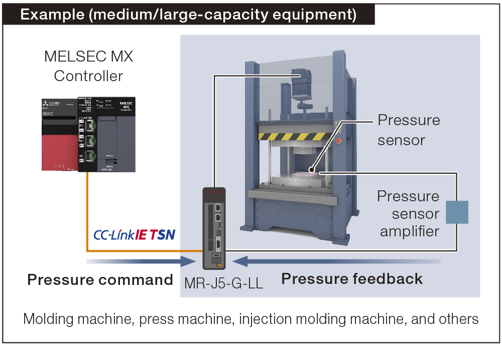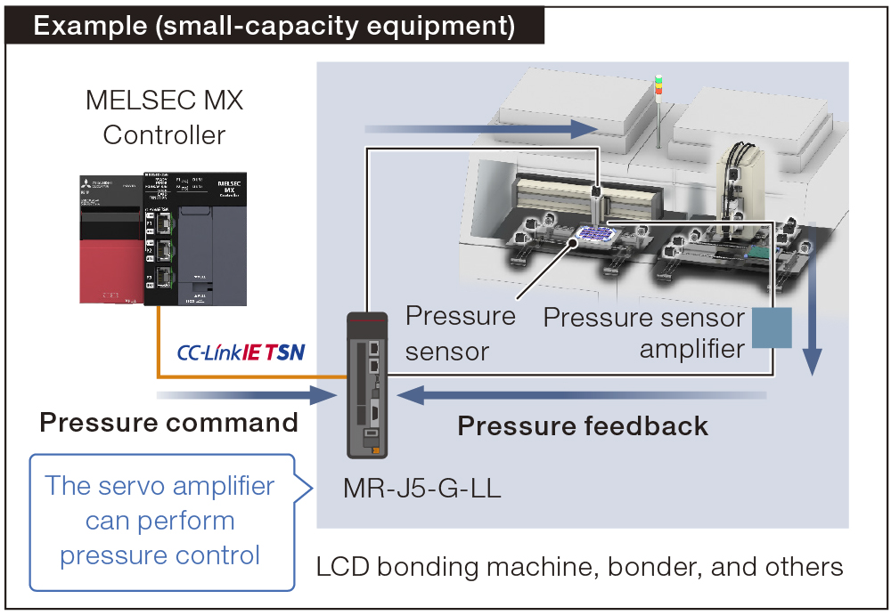 By combining the MX Controller with the MR-J5-G-LL, which supports cyclic pressure control mode (cspr), the servo amplifier performs feedback control of pressure according to the pressure command of the function block. The pressure control loop operates independently of the controller, achieving high-speed and high-response control.