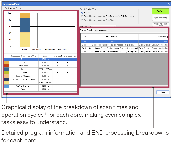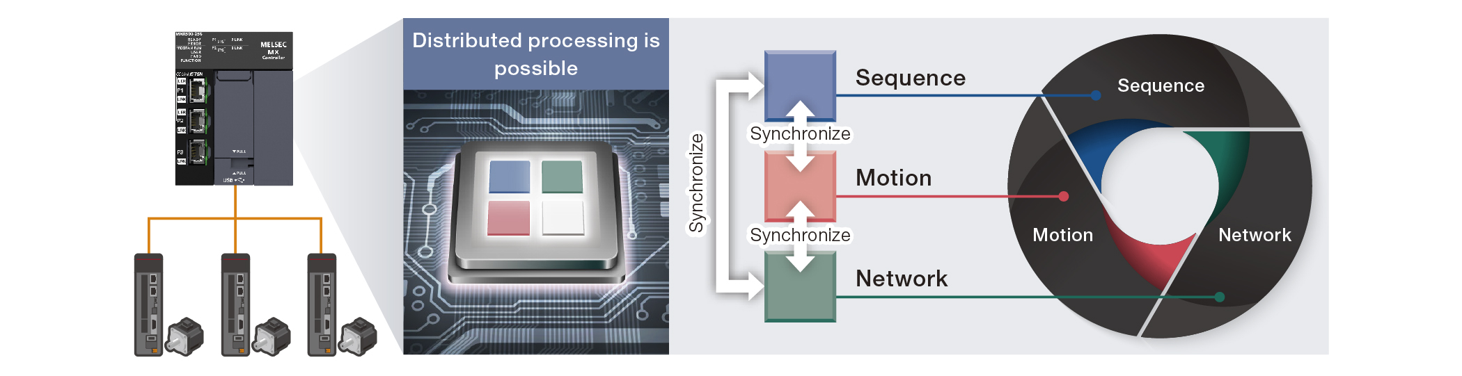 A high-speed multi-core MPU significantly increases processing performance, including double-precision floating-point operations. Inter-core communication allows multiple cores to perform different tasks simultaneously, enabling parallel high-speed sequence, motion, and network control. Distributed control across cores shortens the overall production cycle.