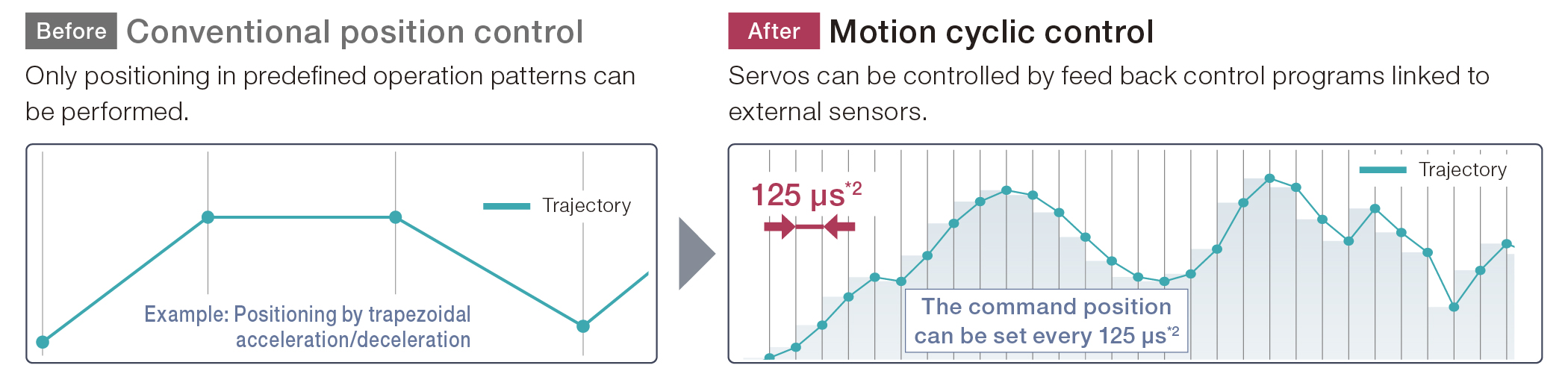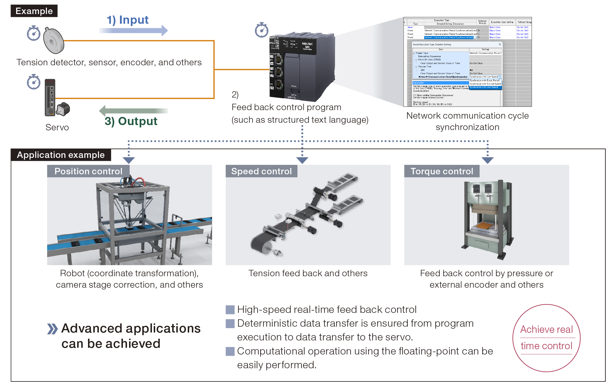 These allow program execution, motion operation, and network send/receive to be performed within the same communication cycle. This makes it possible to implement advanced control loops that generate control commands from the user program in real time and instantly transmits sensor values to drives.
