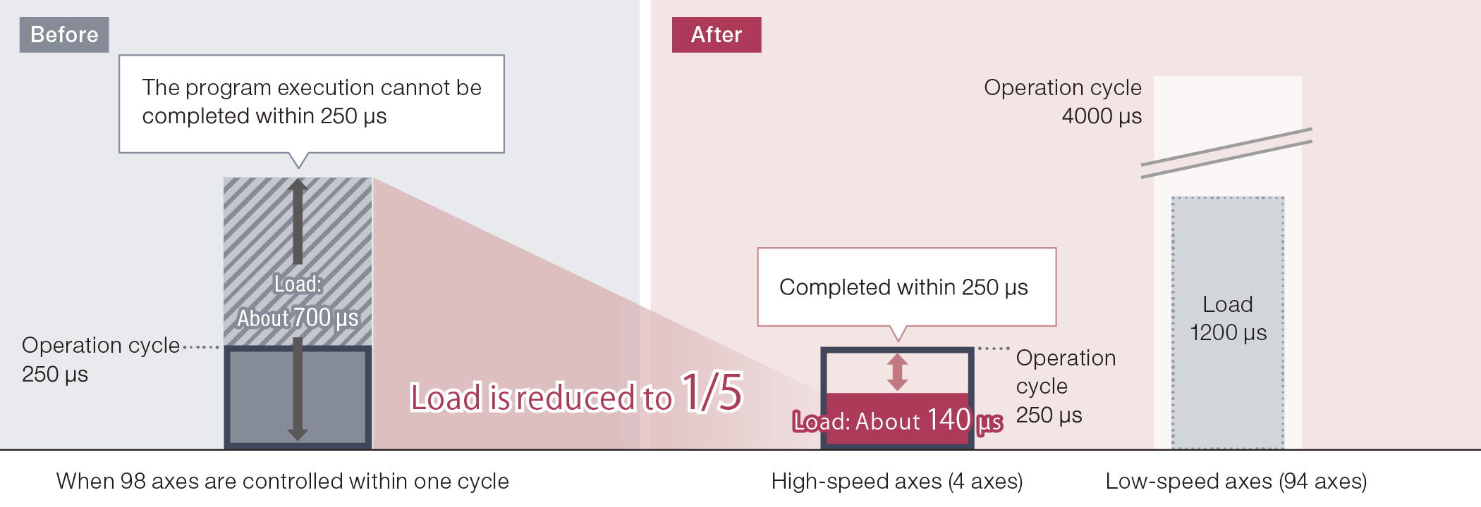 With one MELSEC MX Controller, up to three different operation and communication cycles can be set for each axis and device station.*1