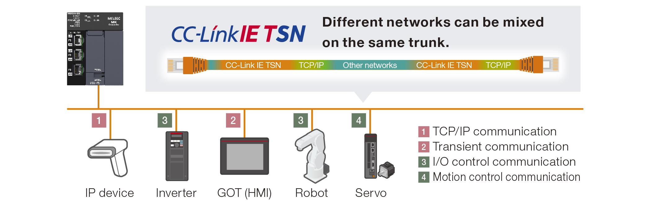 TSN is a set of international standards, which define the time synchronization method and the time sharing method. By adding these to Ethernet technology, control communications (ensuring real time reaction), which cannot be perform with conventional Ethernet, and information communications (non-realtime communications) can be performed together.