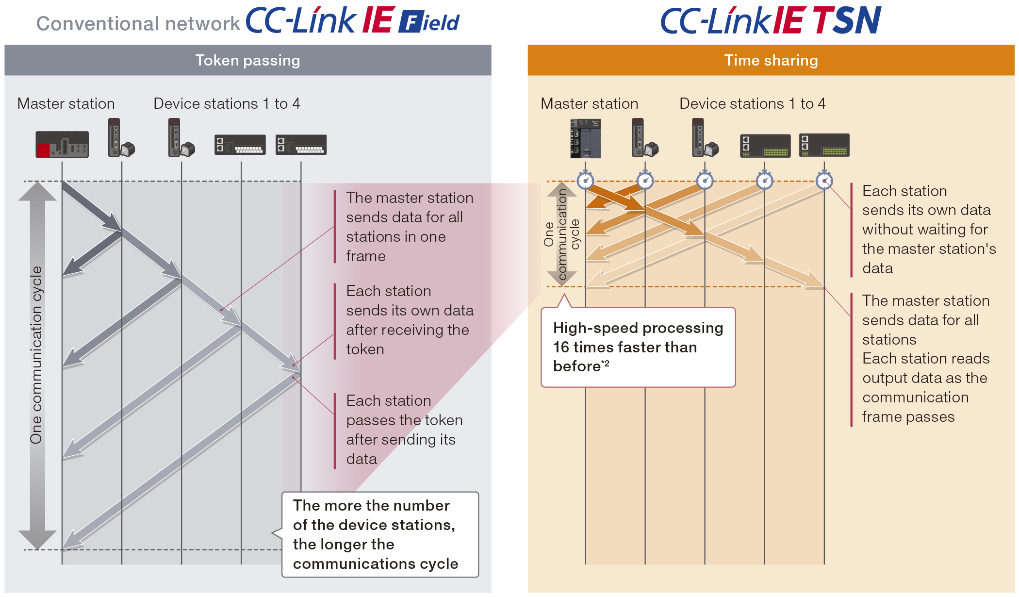 The CC-Link IE TSN time sharing method enables communications independent of the number of device stations