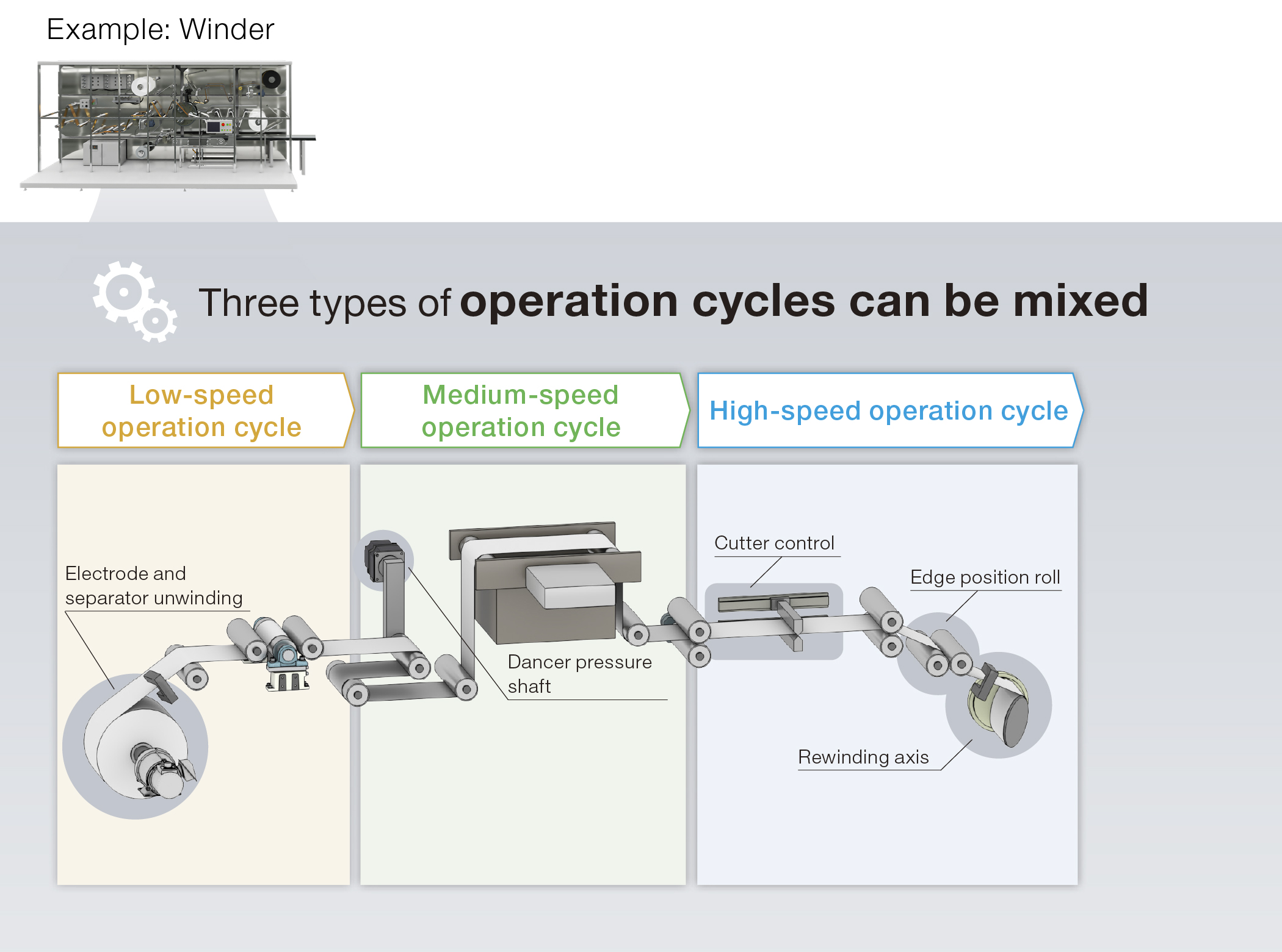 Software replaces machinery mechanisms (such as gears, shafts, speed change gears, and cams) for easier synchronous control. Even for machines that require multi-axis synchronization, such as winders and coaters, it is easy to adjust the cam control and operation pattern to eliminate position deviation. Fine-tuning the cutting position and adjusting the synchronization position according to the transportation speed can achieve high quality and high productivity.