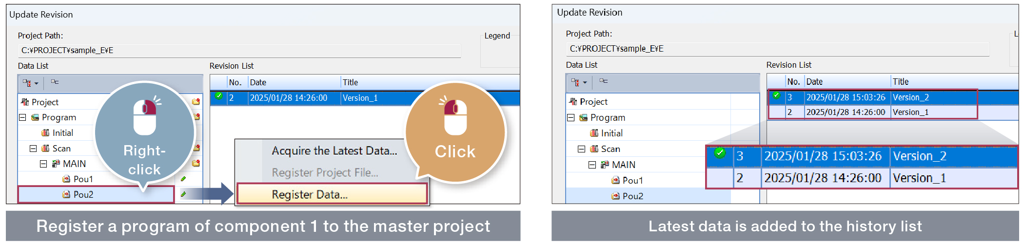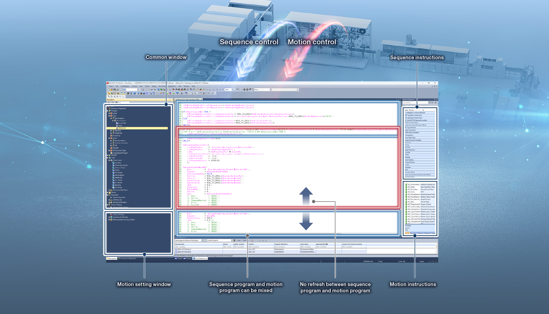 Sequence control and motion control programs are combined into one. There is no need to create separate programs for each module or exchange data, simplifying your programs. With a single tool handling both sequence and motion control programs, you can easily modularize the program into components, manage change history, and debug.