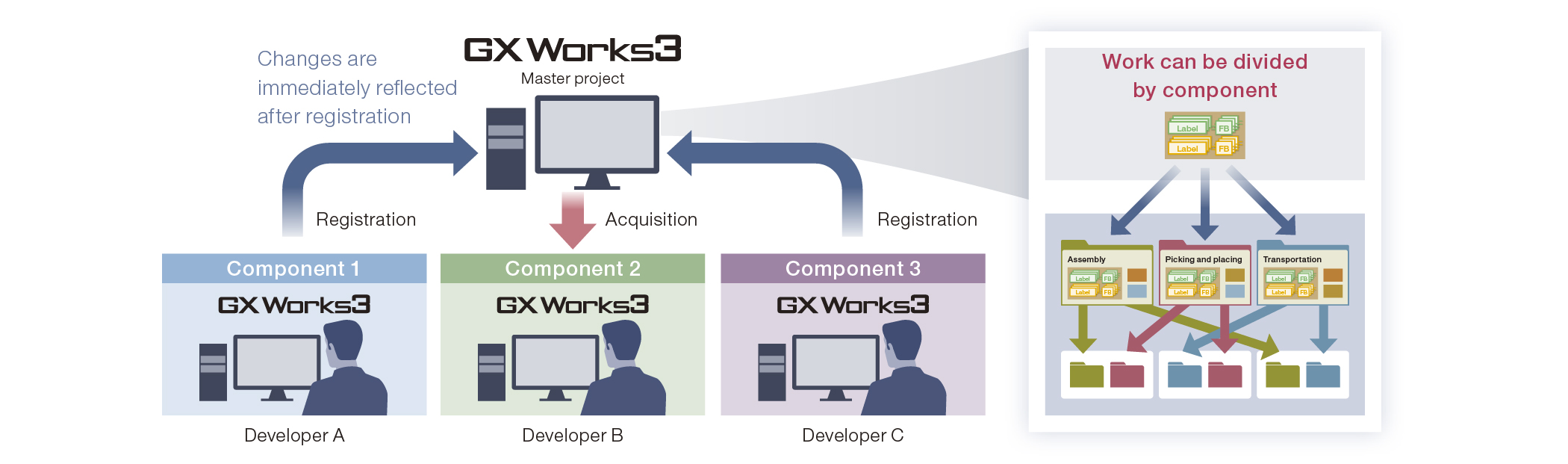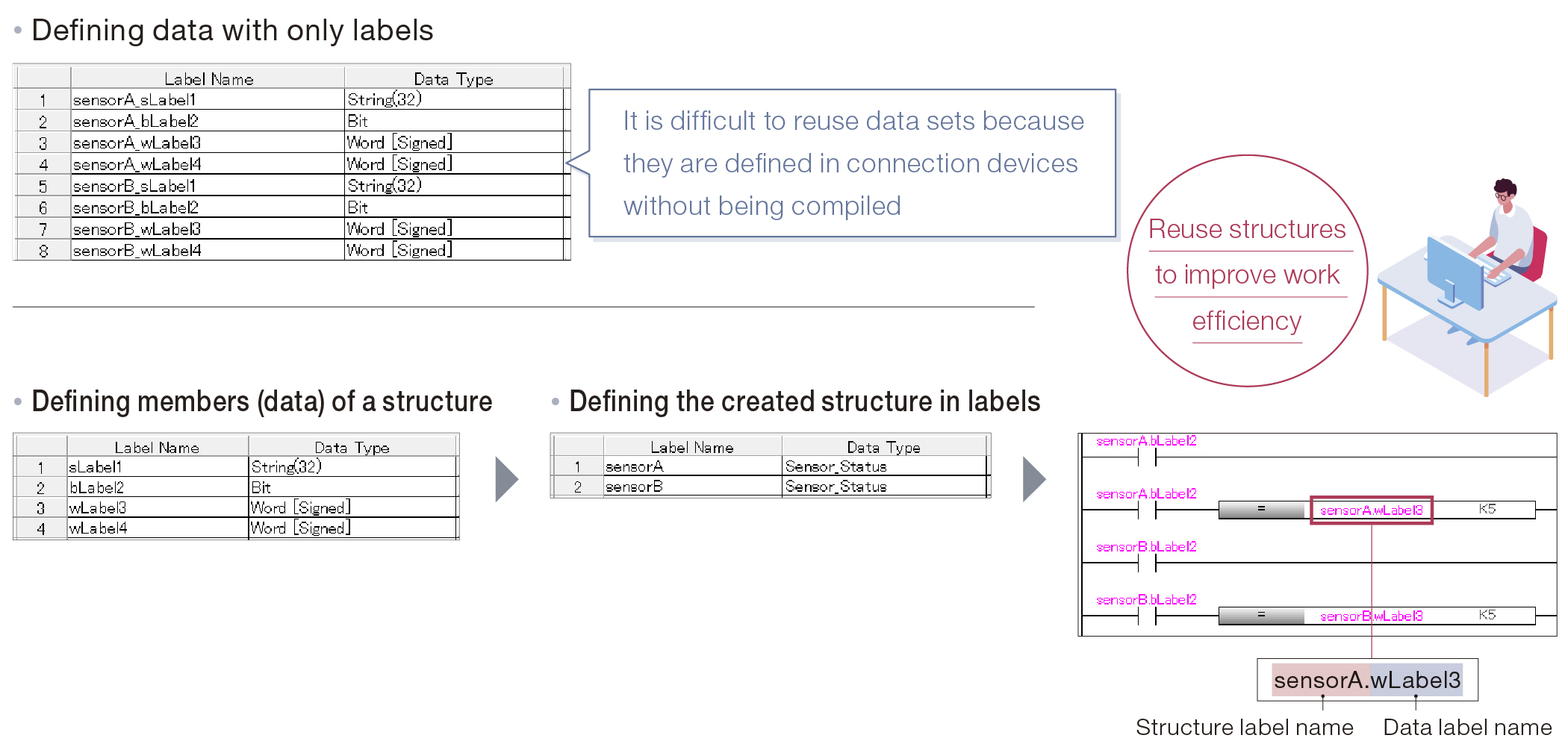 Increase program reusability by using label names, FBs, structures, and arrays to modularize a program into components. This approach not only reduces development time but also creates more readable programs. It also ensures consistent programming quality regardless of developer skill level. Each component can be assigned to a specific member, clarifying roles and responsibilities.