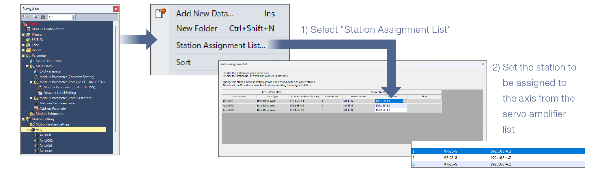 You can view a list of stations assigned to each axis and change their IP addresses.