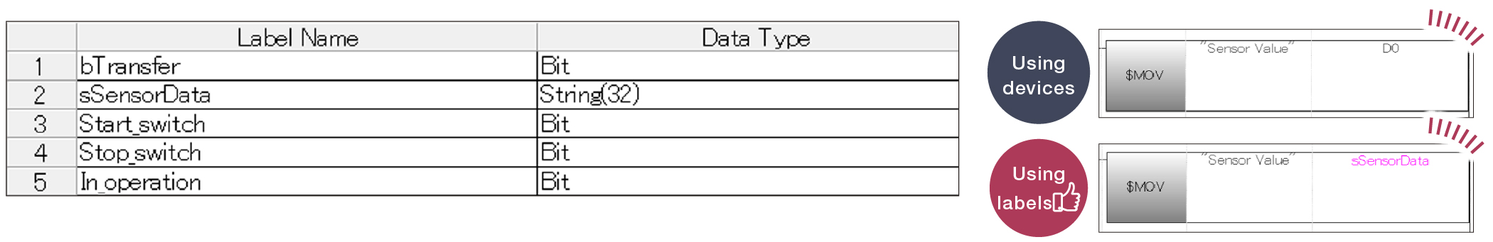 Improve program readability by managing signals such as sensor signals with labels named according to their role and use. Using labels allows you to program without worrying about devices used in other programs when creating multiple programs.
