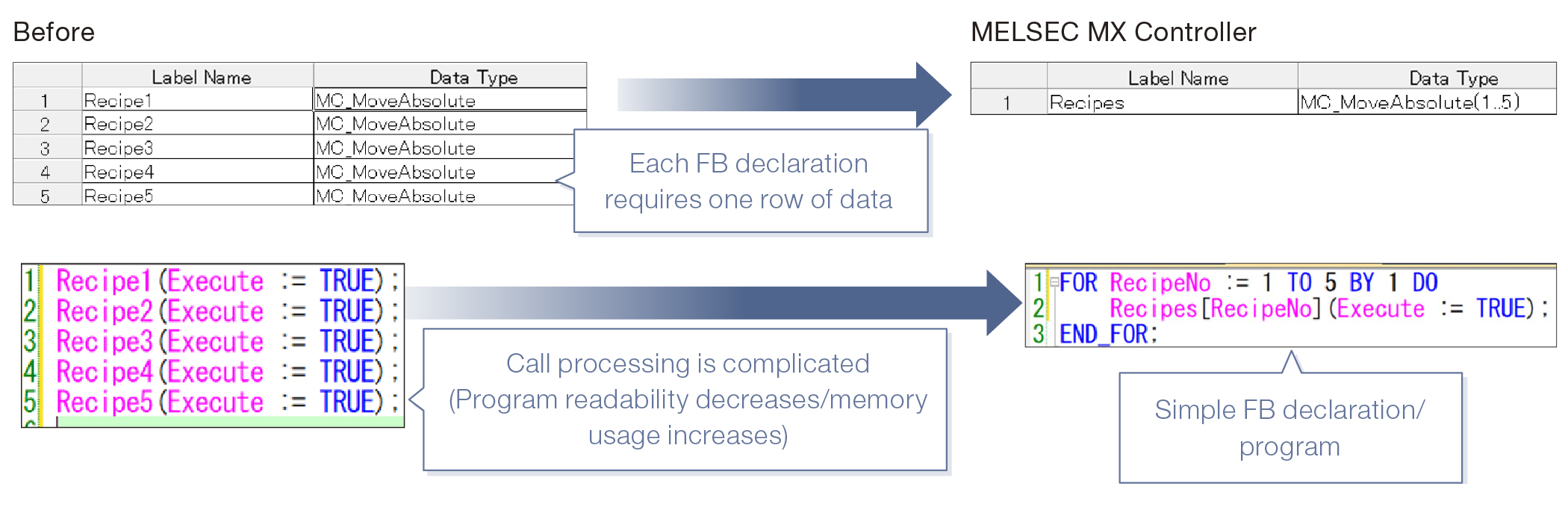 By defining elementary data types, structures, and FB types as an array, the same FB can be declared/described at once. The program can be simplified because there is no need to call the same FB again.