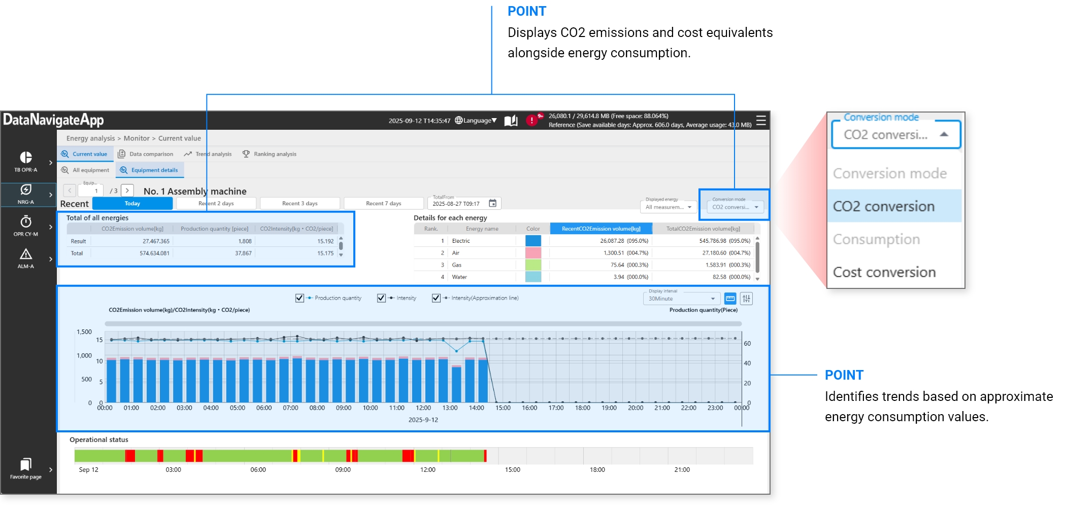 Visualizes and analyzes equipment energy consumption (such as electricity and airflow rate), linked to the equipment’s operation status.