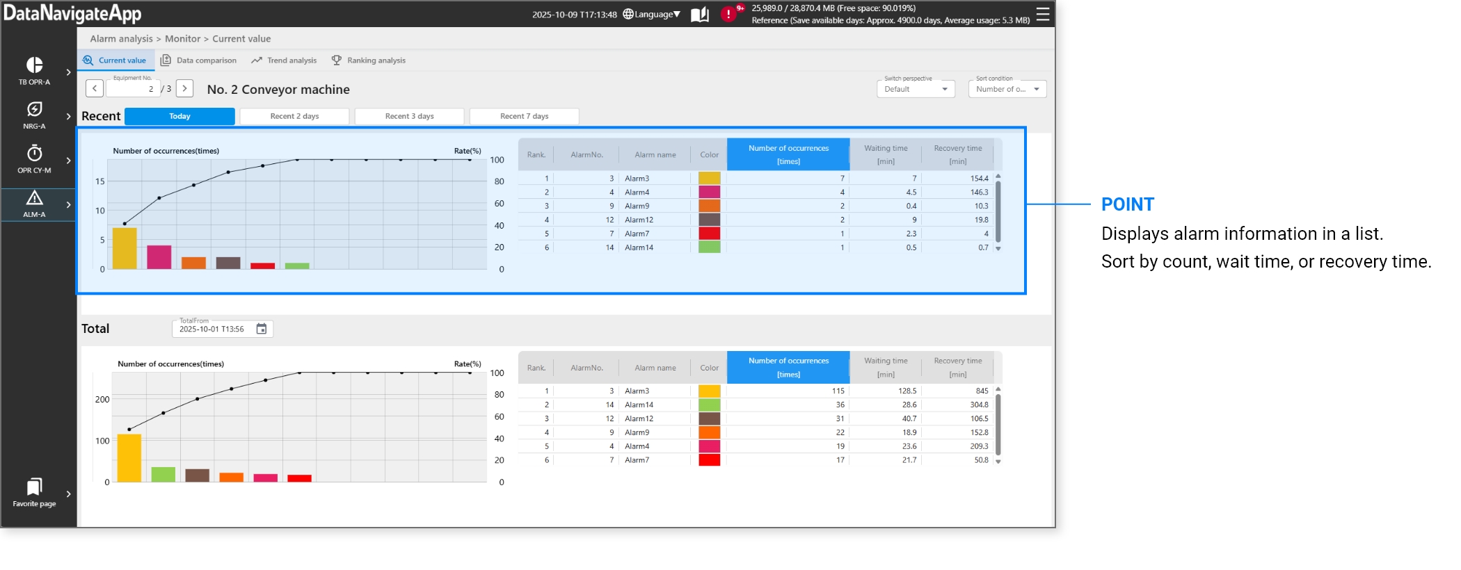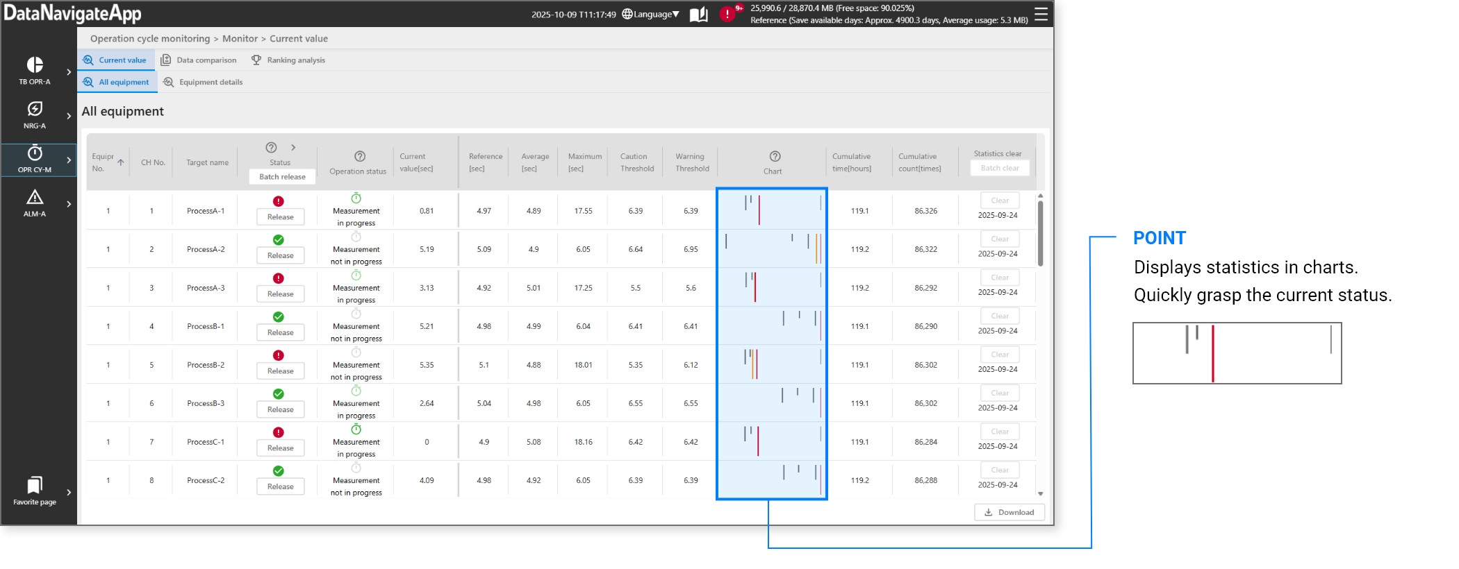 Visualizes and analyzes equipment status (operating, stopped, non-operating, etc.).