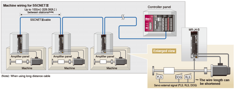 - Long distance wiring is possible up to 3200 m (10498.69 ft.) per system (maximum of 100 m (328.08 ft.) between stations x control axes up to 32 axes), suitable for large-scale systems.