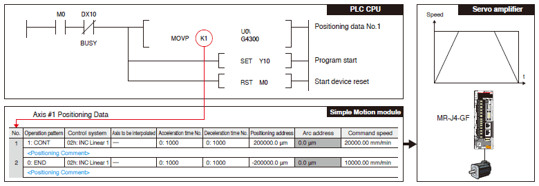 - Automatic operation can be executed by setting the positioning addresses and speeds, etc., to a sequence program.