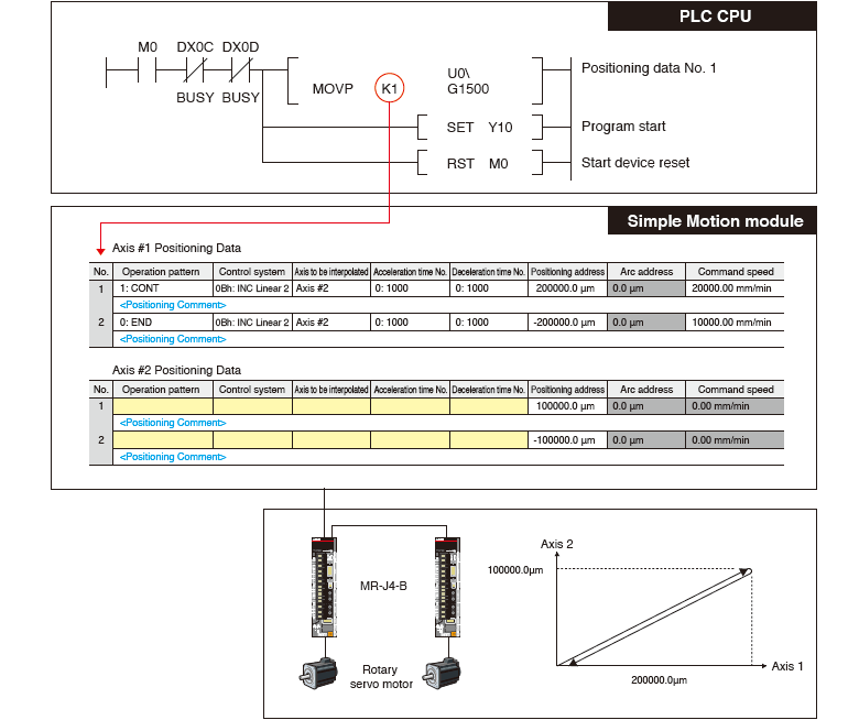 - To respond to various application needs, the Simple Motion module offers various control methods, such as linear interpolation, 2-axis circular interpolation, fixed-pitch feed, and continuous path control.