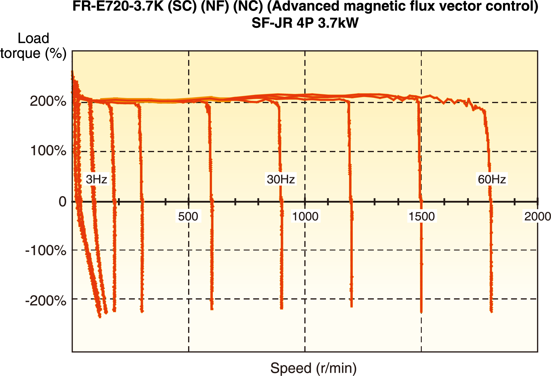 High torque 200%/0.5Hz is realized by Advanced magnetic flux vector control (3.7K or less)