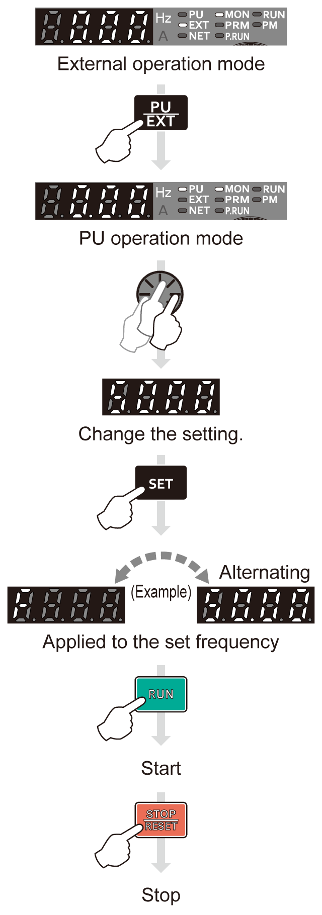 - Switches between the PU operation mode, the PUJOG operation mode, and the External operation mode.