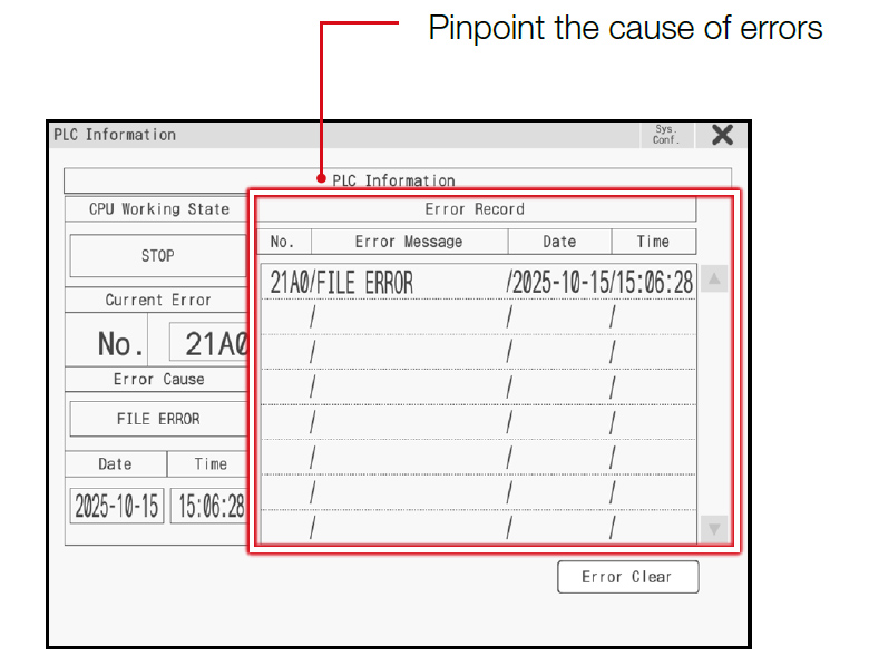 - The error details of the controller, program operation status, and device status can be checked on the GOT’s web browser without a PC, allowing for quick initial assessments during trouble.