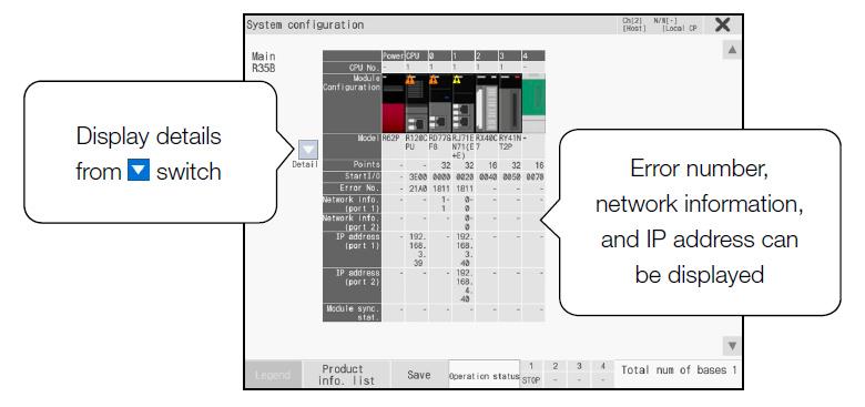 The system configuration of the programmable controller connected to GOT can be checked graphically. You can confirm the product information, such as the serial numbers of each unit, without a computer with a dedicated engineering tool installed.