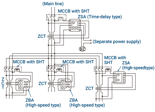 - Ground fault selective coordination can be achieved by installing a time-delay type on the main line and a high-speed type on the branch.