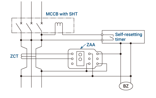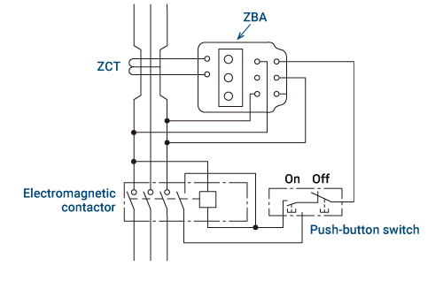 - The figure shows an earth leakage indicator using the ZBA model, but to reset automatically, connect the control power supply to the load side of the electromagnetic contactor.
