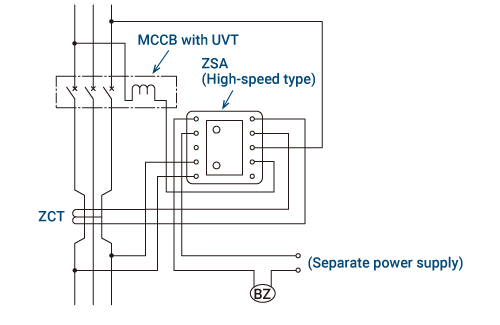When using the ZBA/ZHA model, connect the control power supply to the line side of the MCCB or to a separate power supply. The MCCB should be turned on again after pressing the reset button.