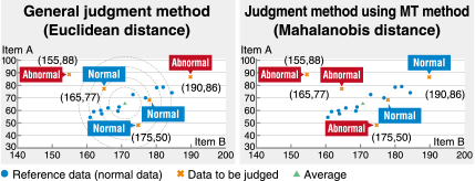 - In this method, a reference (unit space) is created from the normal data, and normality/anomaly is judged from the degree of deviation (Mahalanobis distance) between the reference and the measured data quantified.