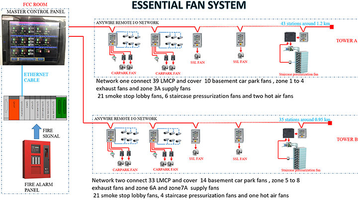 Essential fan system comprised with car park ventilation fans, smoke stop lobby fans and staircase pressurization fans.