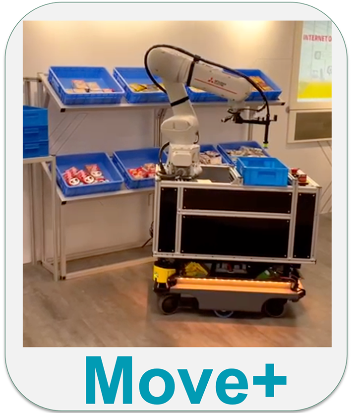 Move+ is a robot picker (Pick+) on an AMR, which allows it to go around a warehouse or factory to collect items. Ideal for order fulfillment.