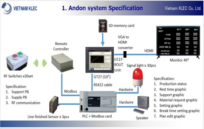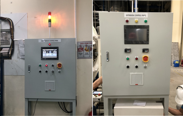 Specifically, we designed two electrical panels sized H1000xW800xD250 and programmed Mitsubishi PLC and applied an E series inverter to control the fabric rolling motor. To ensure the monitoring and connection process, we have developed the GOT 10 HMI interface and use the CC link communication network.