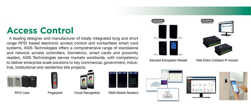 A leading designer and manufacturer of totally integrated long and shortrange RFID based electronic access control and contactless smart card systems, ASIS Technologies offers a comprehensive range of standalone and network access controllers, biometrics, smart cards and proximity readers. ASIS Technologies serves markets worldwide, with competency to deliver enterprise scale solutions to key commercial, government, industrial, institutional and residential site projects.
