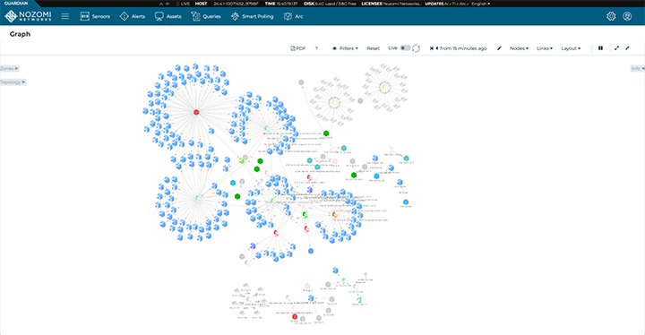The Nozomi Guardian security sensor passively observes local network traffic to provide comprehensive OT and IoT asset visibility and monitoring. Guardian continuously monitors network activity to discover new assets communicating on the network, provide network visualizations for troubleshooting and research, identify critical vulnerabilities, and detect cybersecurity threats and operational issues.