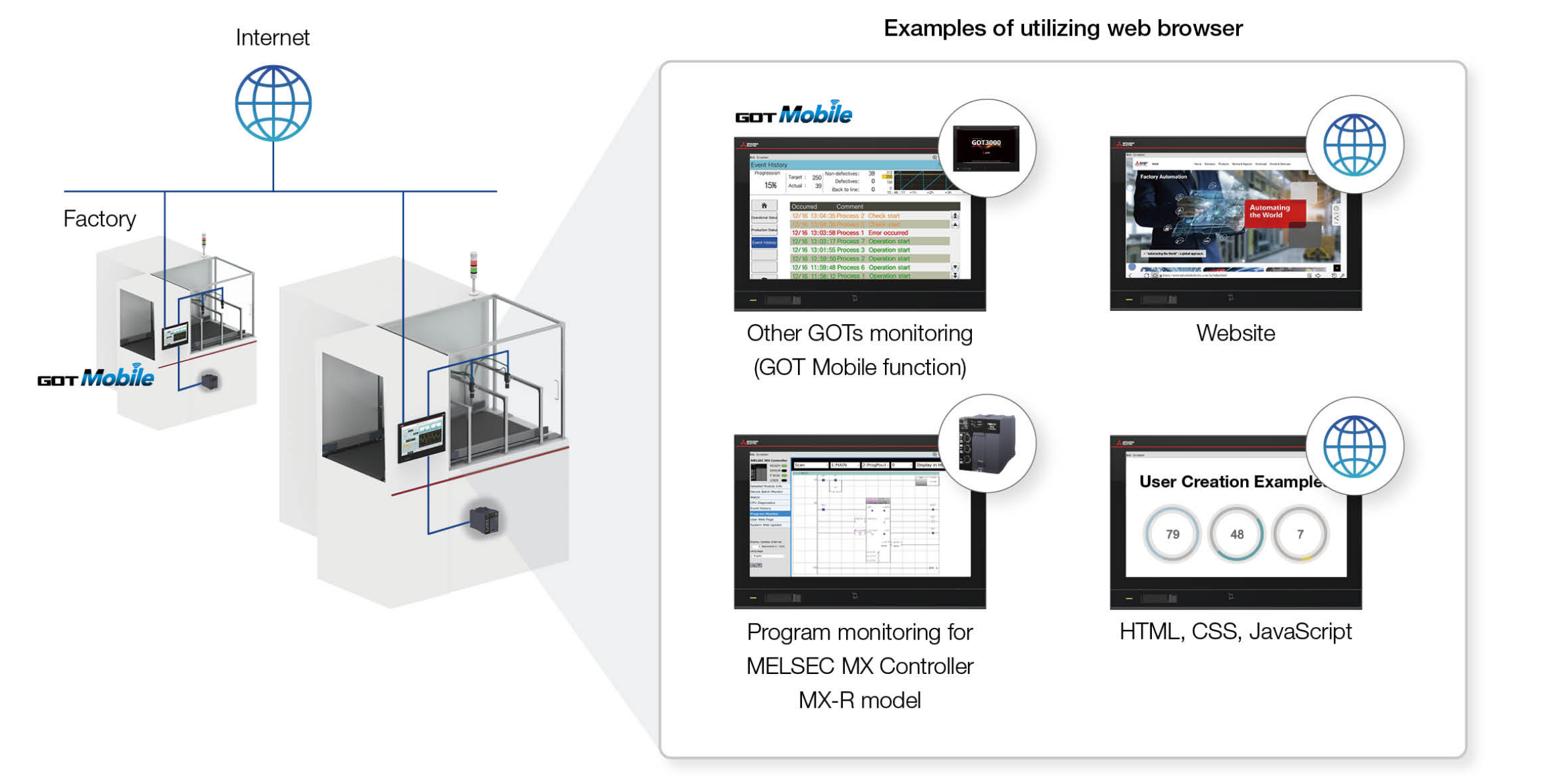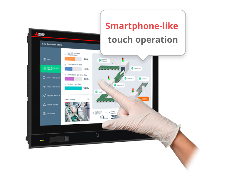 The GOT3000 features a built-in web browser, which includes the GOT Mobile function for monitoring other GOT devices. If connected devices support web server function, operators can quickly perform initial troubleshooting via the browser without needing a PC or tablet. Standard website viewing is also supported.