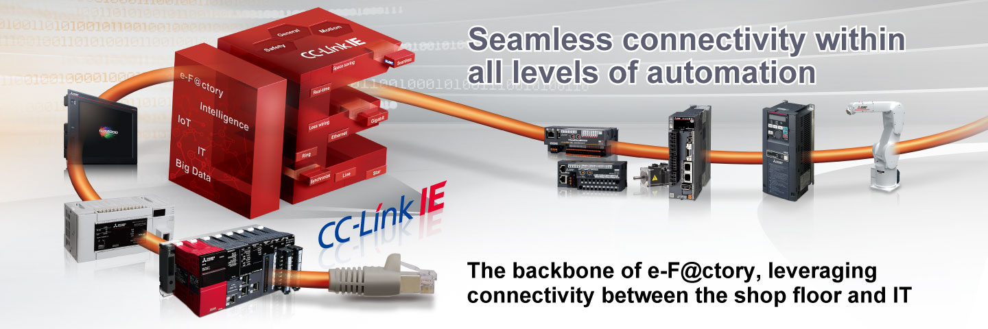 CC-Link IE incorporates general distributed control, synchronous motion control, and safety control enabling safety communications across multiple safety devices, all on the same network. The topology is quite versatile, based on twisted-pair cables, which enables flexibility in system configuration while helping to keep installation cost low.