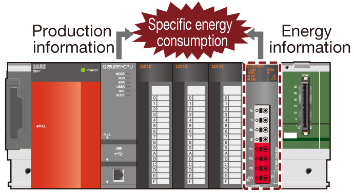 - Allows for easy specific energy consumption *3 management by matching the “production information” of the CPU module with the “energy information” of the energy measuring module.