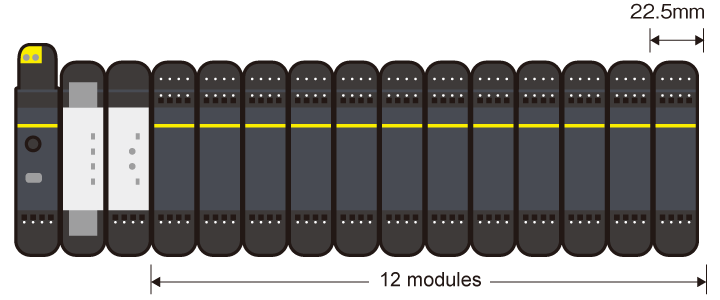 - Up to 12 safety input and I/O modules, 4 safety relay output modules, and 2 network modules can be installed